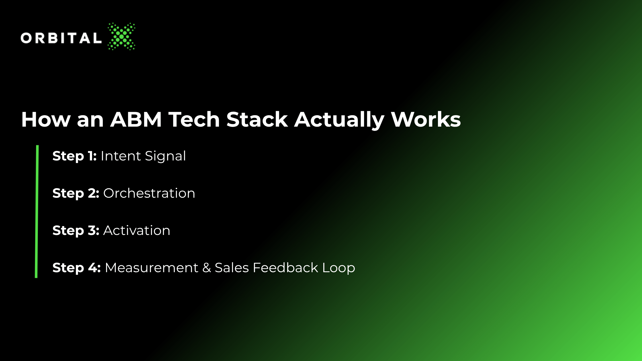 An effective ABM tech stack is a signal-driven engine where each stage feeds the next. It’s a continuous loop, not a linear funnel, that moves accounts from initial intent to closed revenue. Each tool supports a different step, from spotting interest to engaging accounts to tracking what actually leads to revenue.