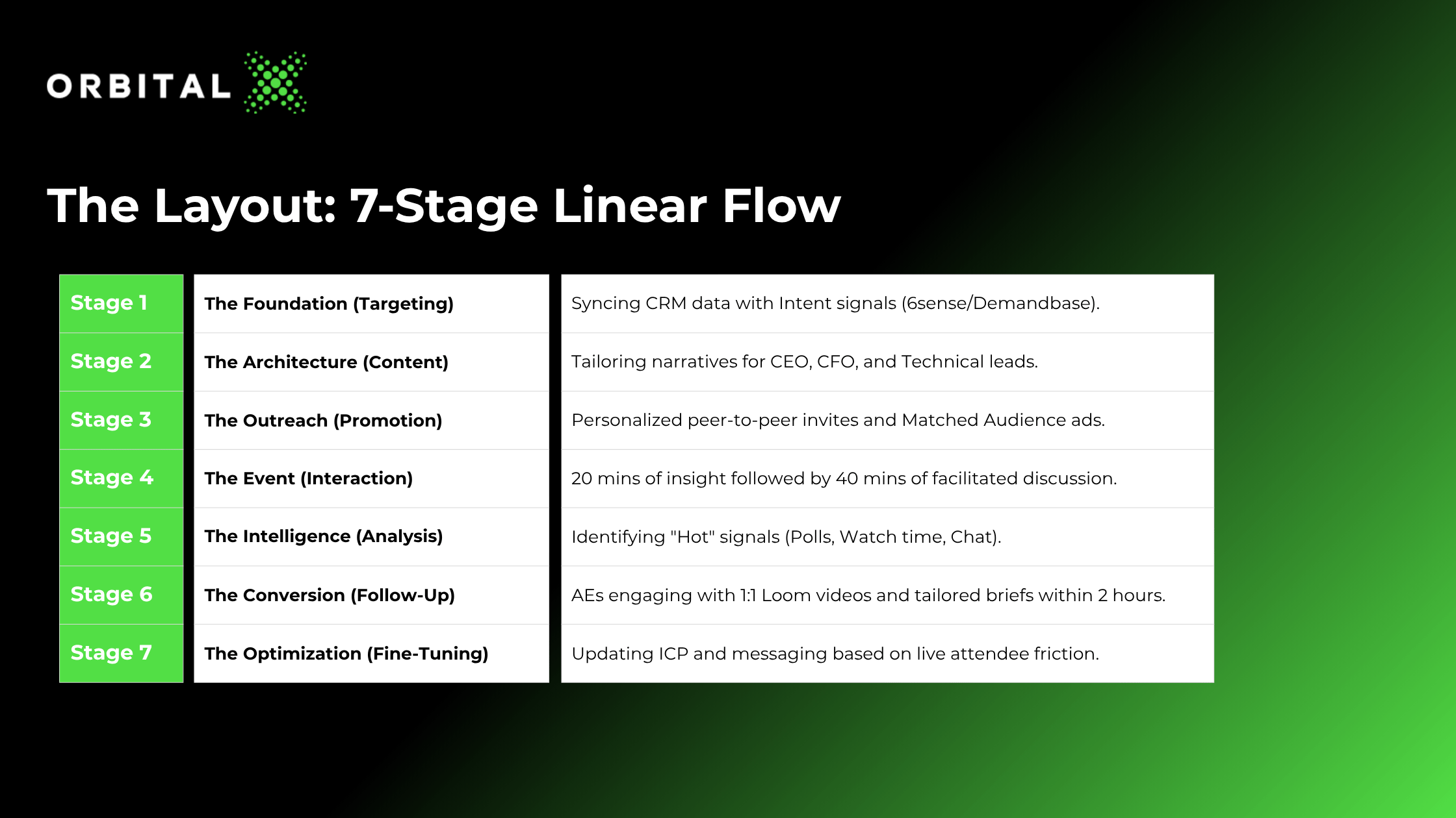 Your tech stack also has to function as a unified system. Your webinar platform, CRM, and intent data need to talk to each other so interactions are captured and made actionable at the account level. Unifying platforms like OrbitalX’s DemandWEBS™ connect these signals directly to real-time sales actions.
